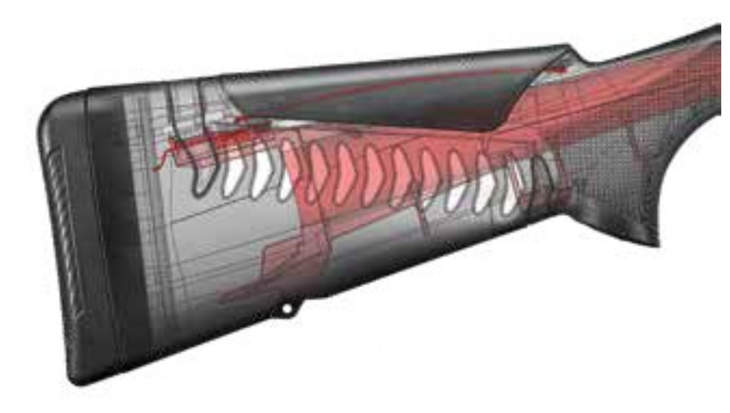 ComforTech was the first recoil-reduction system of its kind. By splitting the stock diagonally and utilizing shock-absorbing chevrons, the entire stock was transformed into a recoil pad. This chevron system, now 16 years old, is still the most efficient design available and was the basis for the SBE 3 stock. The chevron size and location has been optimized on ComforTech 3. Further, Benelli engineers created a new cheek-comb pad called Combtech, which greatly reduces facial impact and vibrations.