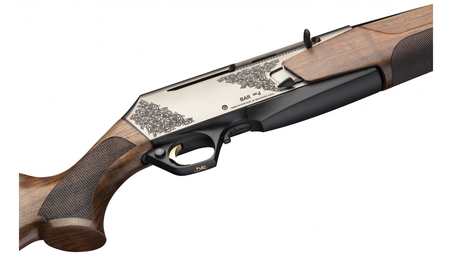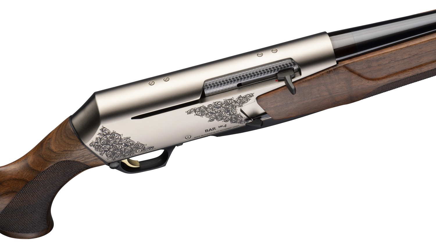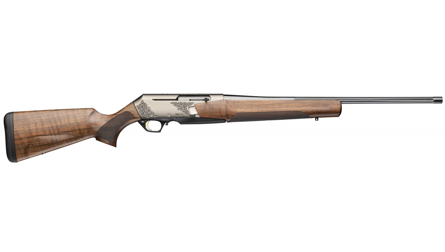 The BAR MK 4 Medallion offers a classic rifle enthusiast a delightful experience, featuring a beautiful Grade III walnut stock with an oil finish. The nickel finish on the intricately engraved receiver enhances the stock and elevates the standard.