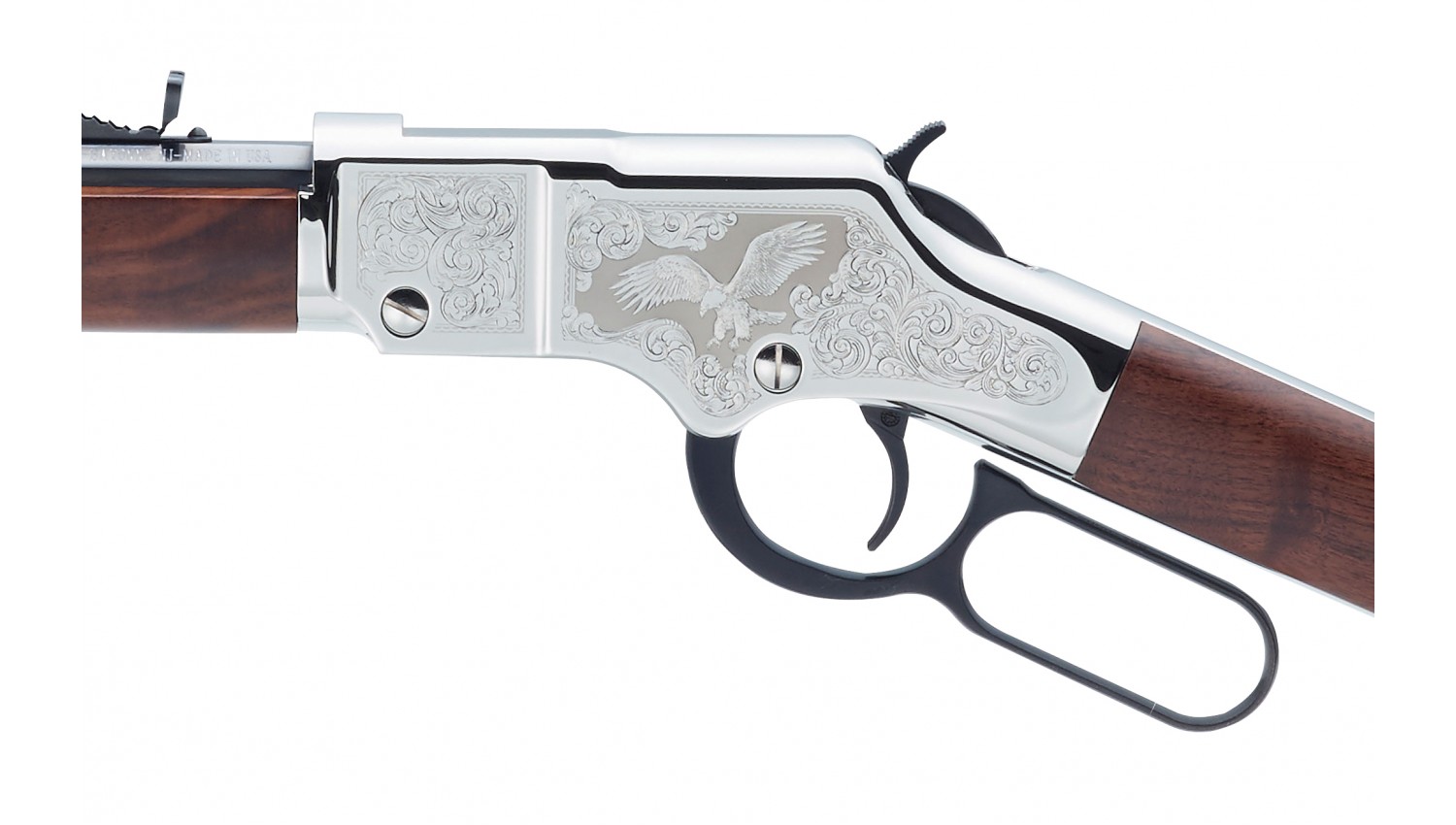 The difference lies in the engraving, and Henry has taken a step away from the Silver Eagle’s historical roots to depict an actual majestic American eagle in flight, wings spread, facing forward into the wind on both sides of the receivers, surrounded by classic 19th Century scroll engraving patterns. The Silver Eagle 2nd Edition’s brightly polished nickeled frame is set off by a slightly darker immediate background for its eagle.