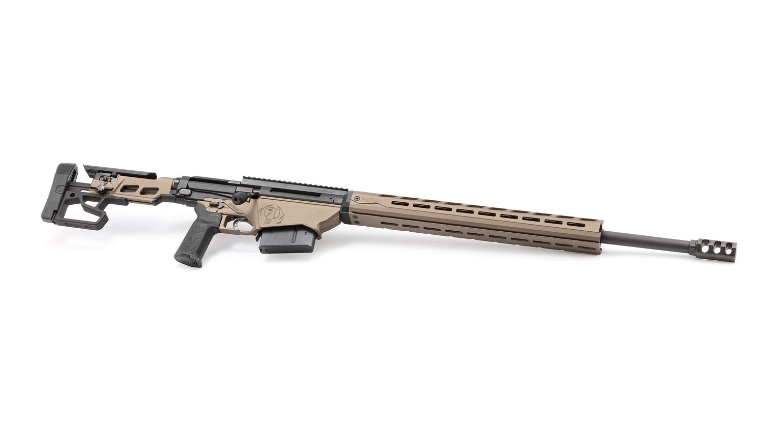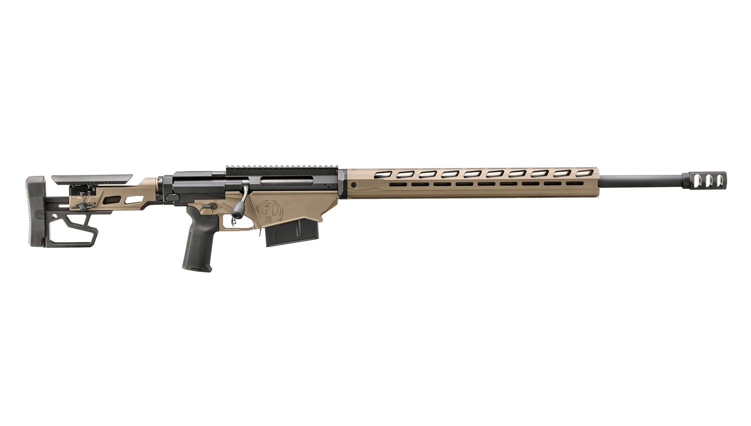 - Heavy-contour (.875" at the muzzle) barrel features a Ruger Precision Rifle muzzle brake to effectively reduce recoil while minimizing noise and blast to the sides of the shooter.