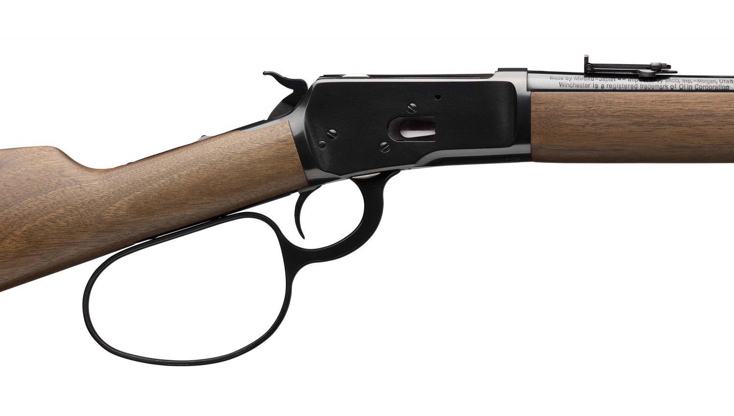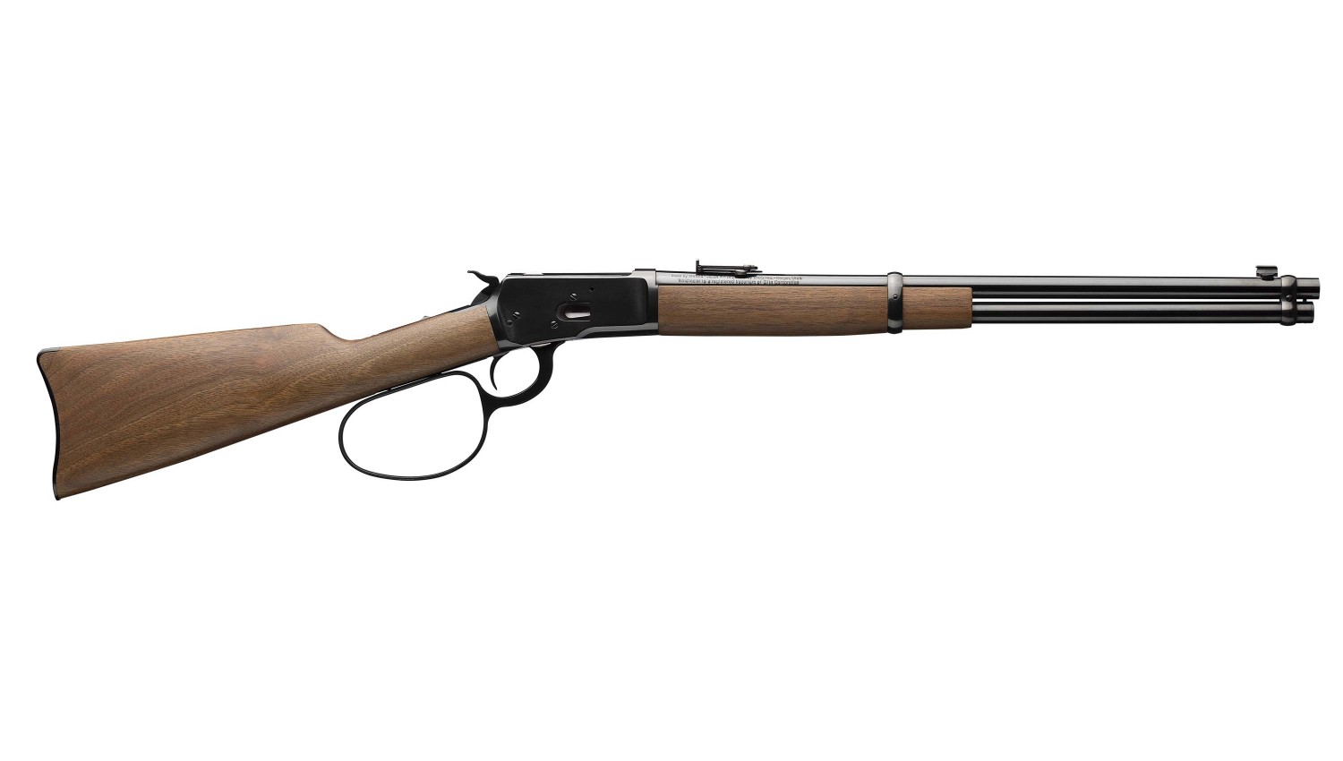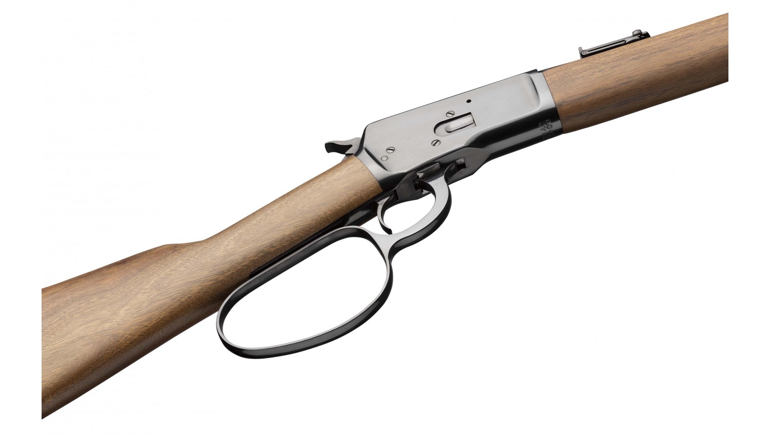 Iconic style large loop lever-action Model 1892, walnut carbine style buttstock and forearm, strap style buttplate, ladder rear sight. Top tang is drilled and tapped for optional peep sight...
